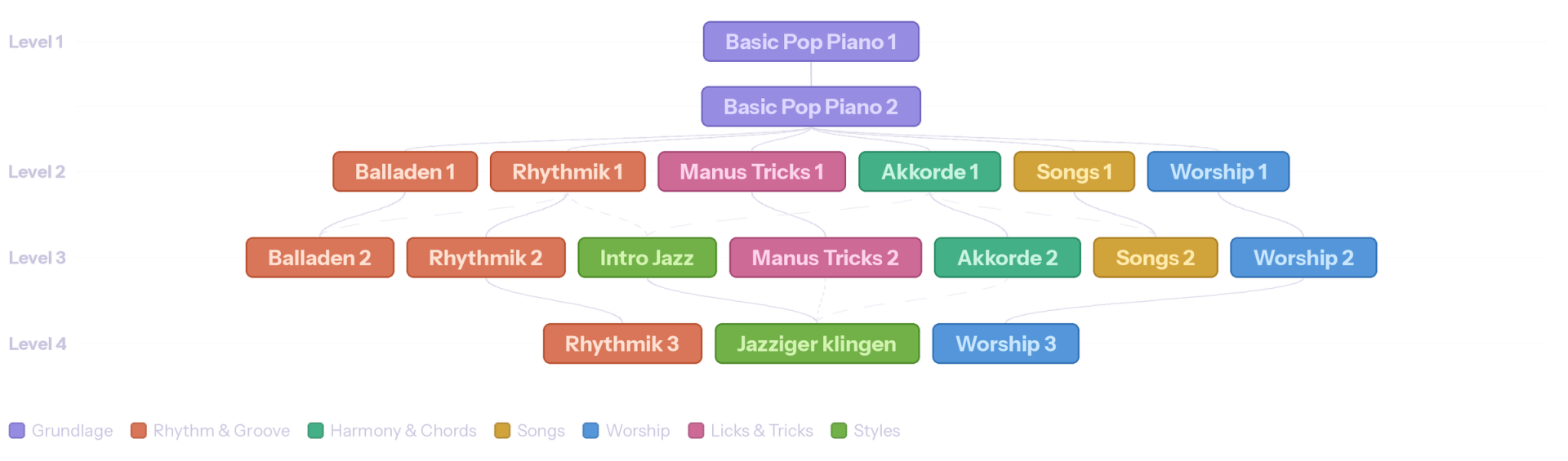 In Piano-Revolution Kursen baut jede Lektion auf der vorherigen auf. Du lernst nicht nur was, sondern in genau der richtigen Reihenfolge — mit passenden Übungen, so lang wie nötig und so kurz wie möglich.